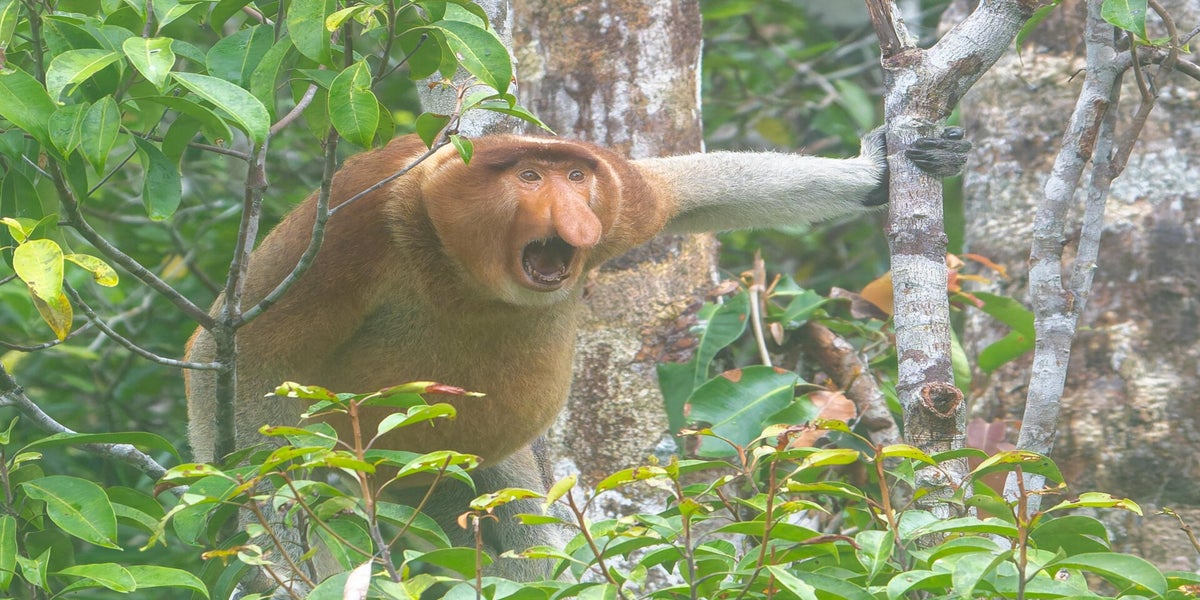 Woher Nasenaffen ihren Namen haben ist wohl klar, oder? Bis zu 20cm kann sie bei Männchen lang werden und dient sowohl als Lockmittel als auch als Resonanzkammer. Morgens und am späten Nachmittag kann man sie beim Springen durch die Bäume am Flussufer beobachten.